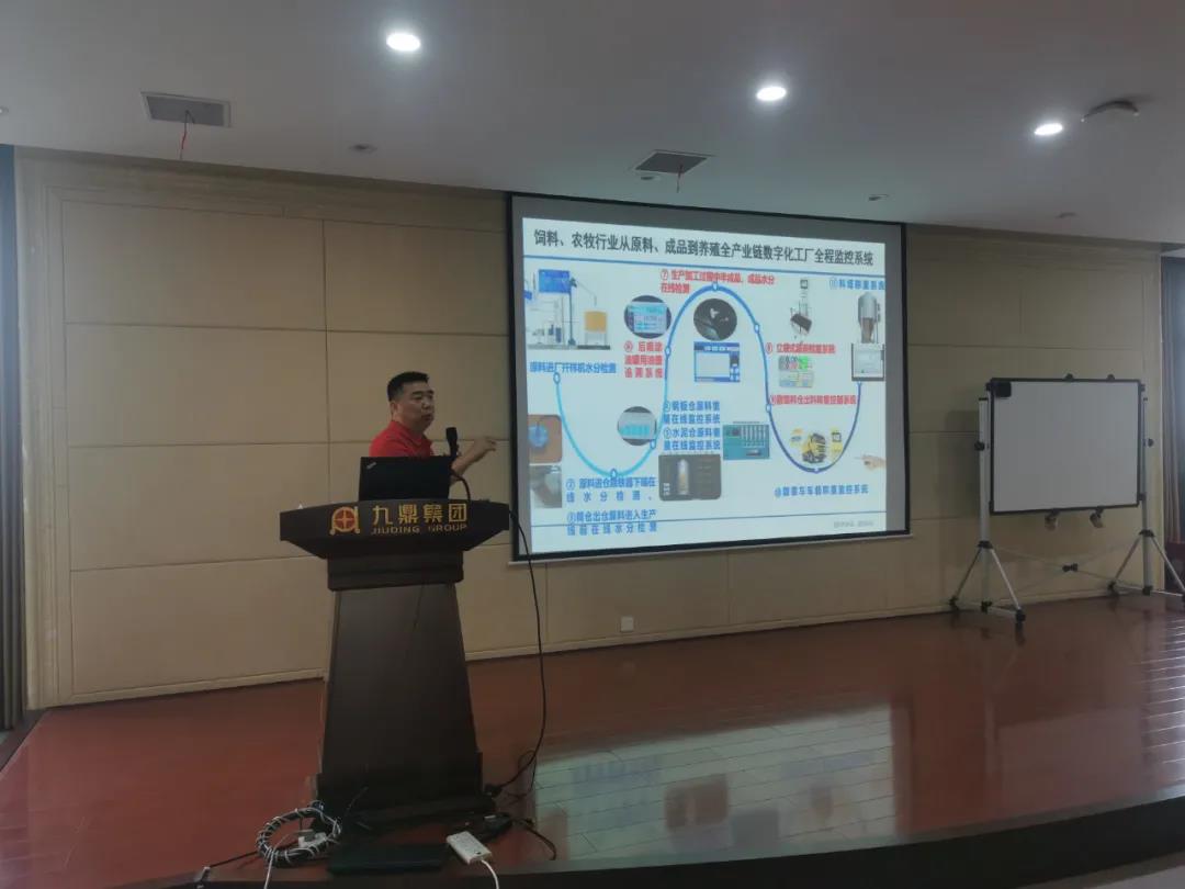 湖南九鼎農牧基地廠長謝爭光在會場進行新工藝/新技術/新設備分享與答疑